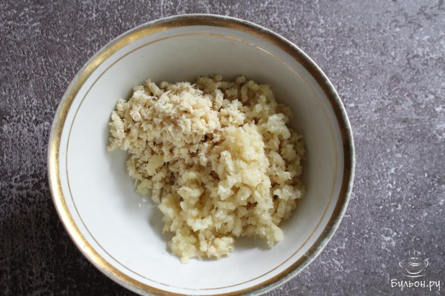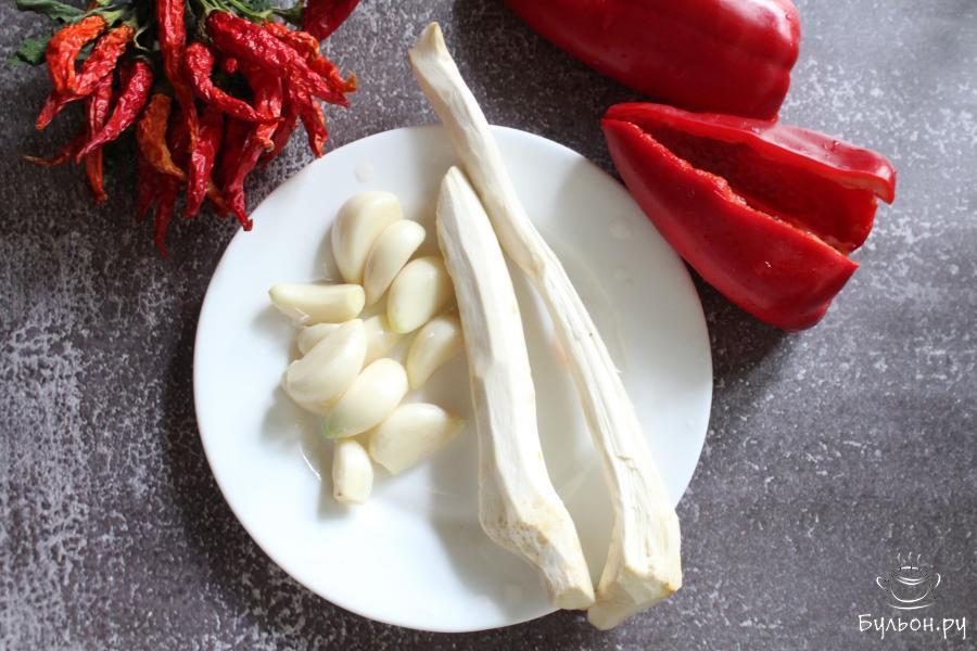 3. Перекрутить чеснок и корень хрена через мясорубку. Удобно перекручивать их в пакет, чтобы не слезились глаза от аромата корня хрена.