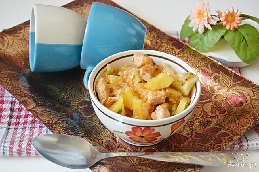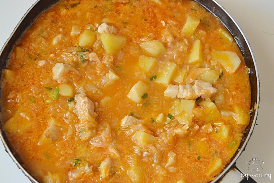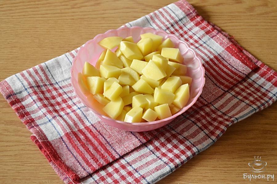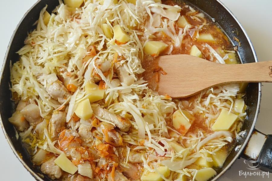 6. Пока тушится капуста, начистить картошку и сразу же добавить картошку к капусте. Если сорт картошки такой, что быстро разваривается, то картошку нужно будет добавить позже, ближе к концу.