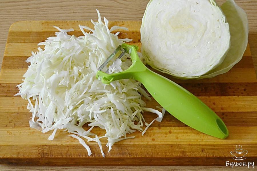 4. Свежую капусту нашинковать. Сделать это можно на специальной шинковке, можно нарезать таким ножом, как у меня или же самым обычным кухонным.
