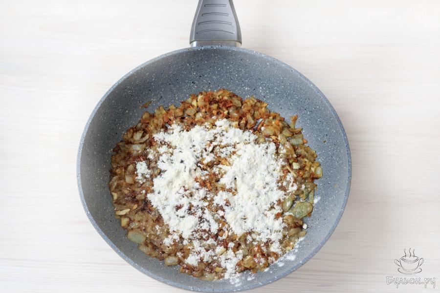 7. Подождите несколько секунд, пока уксус выпарится, а затем добавьте пшеничную муку. Помешивая, обжарьте смесь на небольшом огне еще 1-2 минуты.