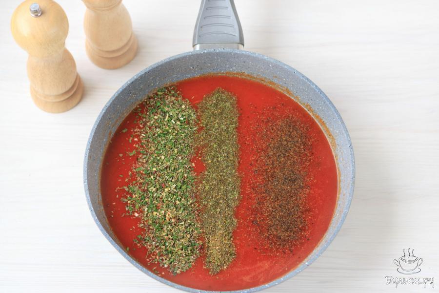 10. Доведите смесь до кипения и добавьте хмели-сунели, смесь сушеных прованских трав, соль и острый молотый перец по вкусу. Хорошо все перемешайте.