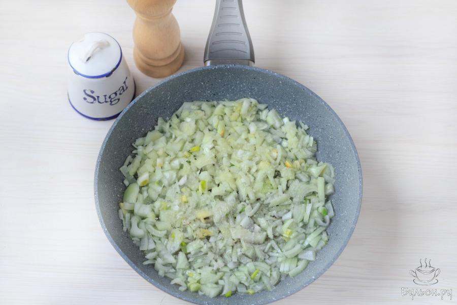 4. В сковороде разогрейте растительное масло. Добавьте мелко нарезанный репчатый лук, 2-3 щепотки соли и 1 чайную ложку сахара.