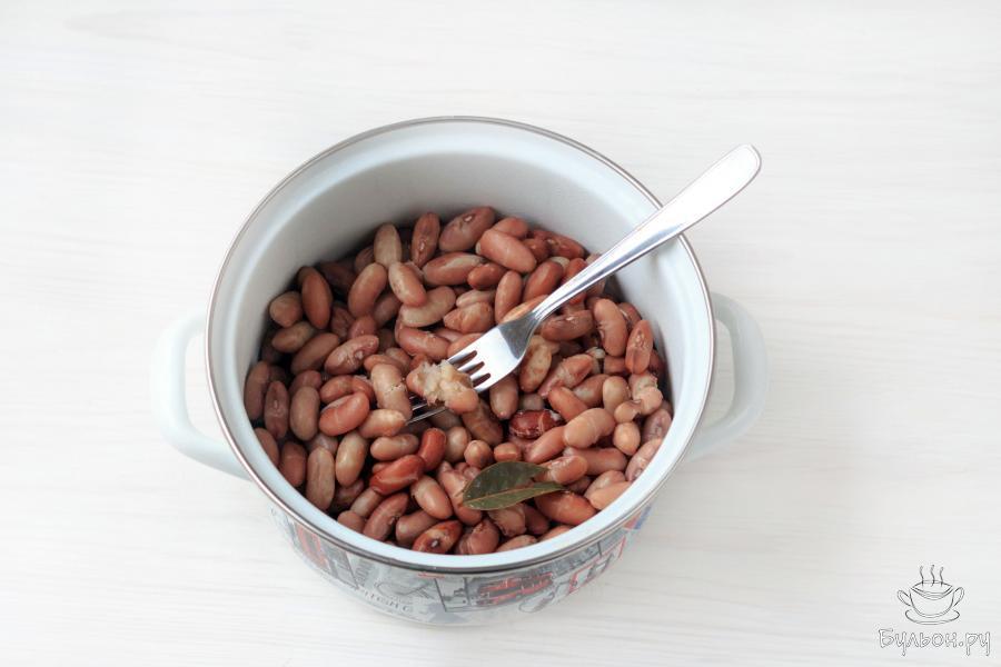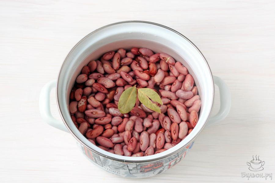 2. Слейте воду в которой настаивалась фасоль и промойте зерна проточной водой. Затем поместите фасоль в кастрюлю, добавьте 2-3 лавровых листа и залейте свежей порцией холодной воды (1.5 литра).