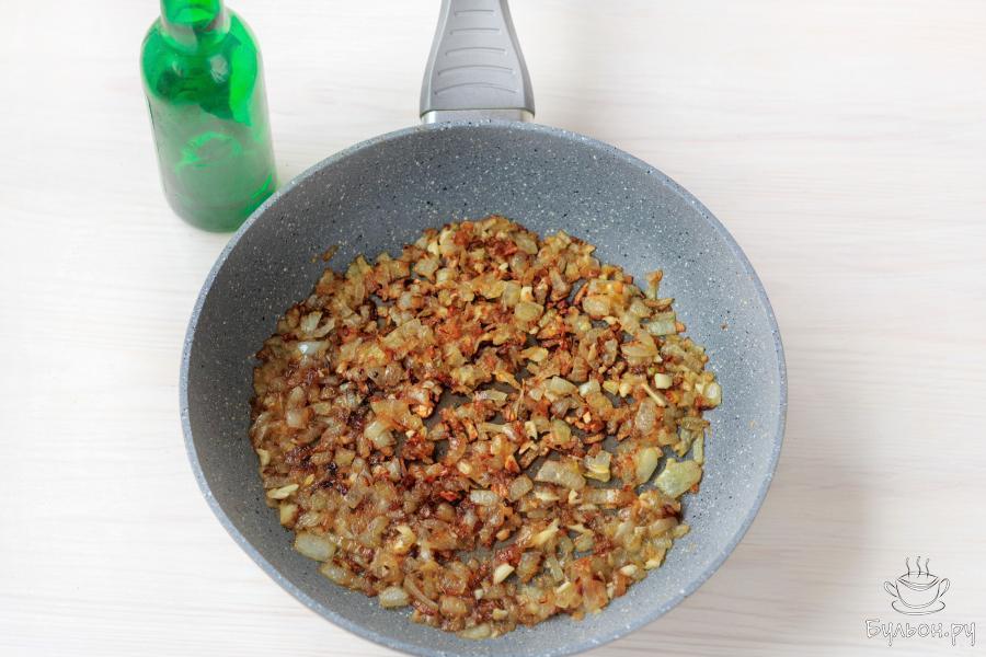 5. Помешивая, обжарьте лук до золотистого цвета. Затем добавьте мелко нарезанный чеснок и обжарьте все еще 1 минуту.