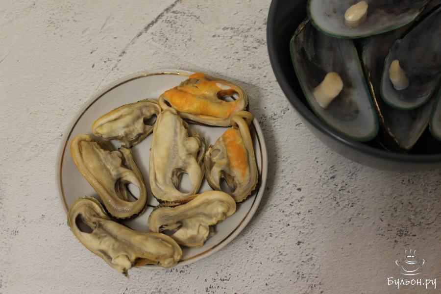 1. Мидии заранее правильно разморозьте, переложив их из морозилки на полку в холодильнике. Мясо мидий отделить от створки, удалить желудок и мышцу мидии, промыть под водой.