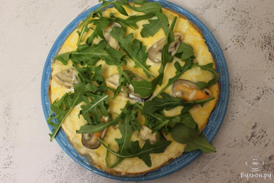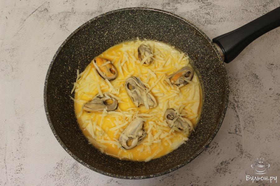 4. Выложите мидии, посыпьте сверху сыром, натертым на крупной терке. Закройте сковороду крышкой и готовьте пиццу до момента, чтобы схватилась яичная масса и сыр расплавился.