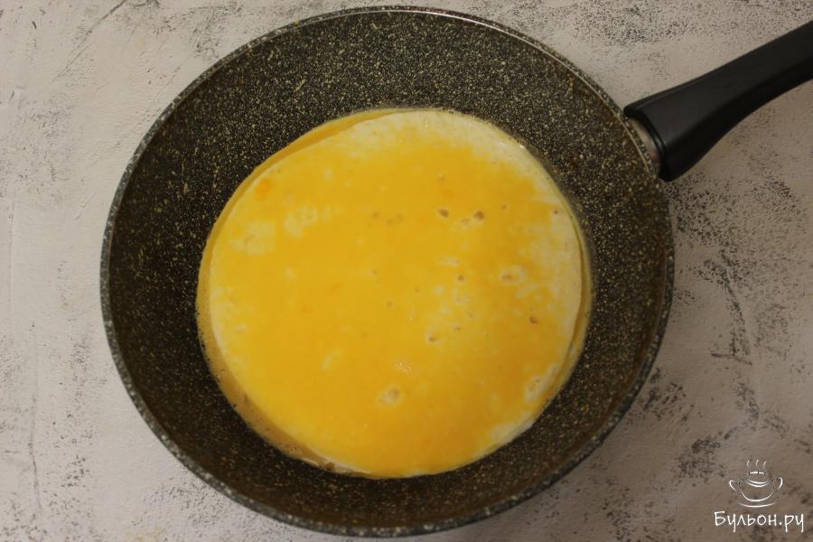 3. На разогретую сковороду выложить одну лепешку, сверху залить половиной яичной массы, положить вторую лепешку и вылить оставшуюся яичную массу.