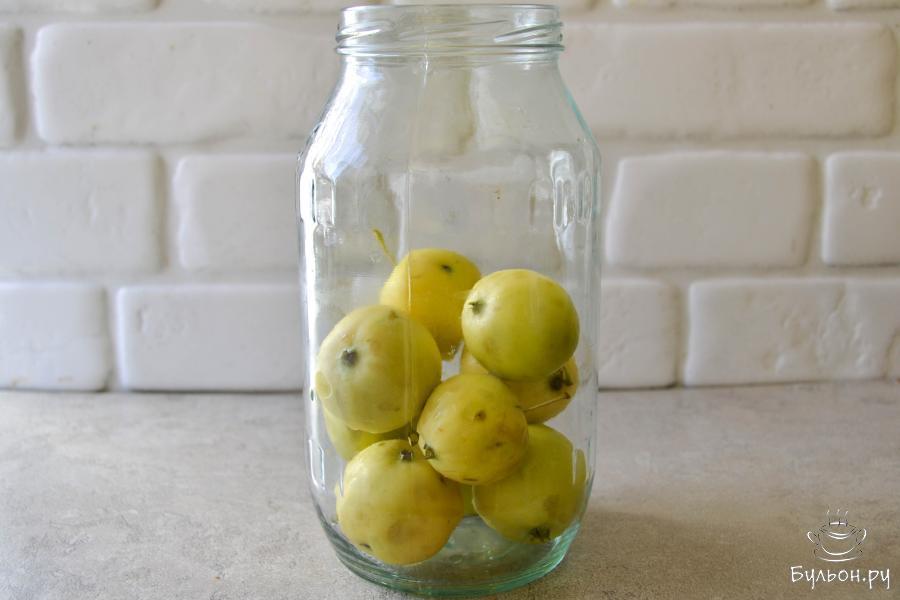 1. Яблоки тщательно промойте. Маленькие яблочки можно использовать целиком, а если у вас крупные яблоки, разрежьте их на ломтики и удалите семенную камеру. Крышку промойте и прокипятите 5 минут. Положите яблоки в банку.