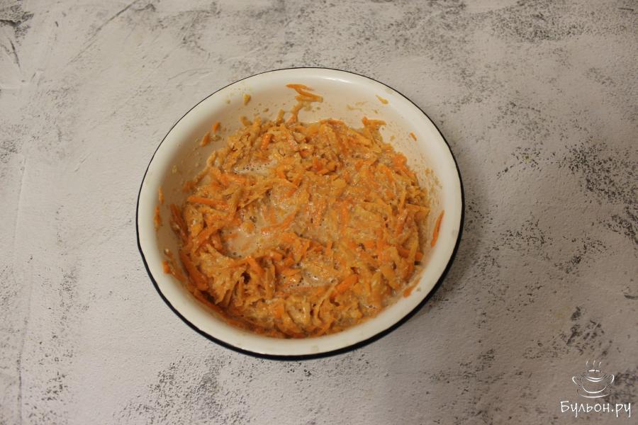 3. К овсяно-яичной смеси добавьте морковь, натертую на крупной терке. Перемешайте и выложите на разогретую сковороду круги-оладушки, обжарьте на сухой сковороде на огне выше среднего.