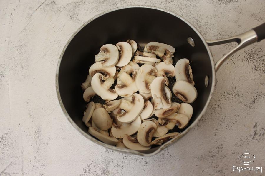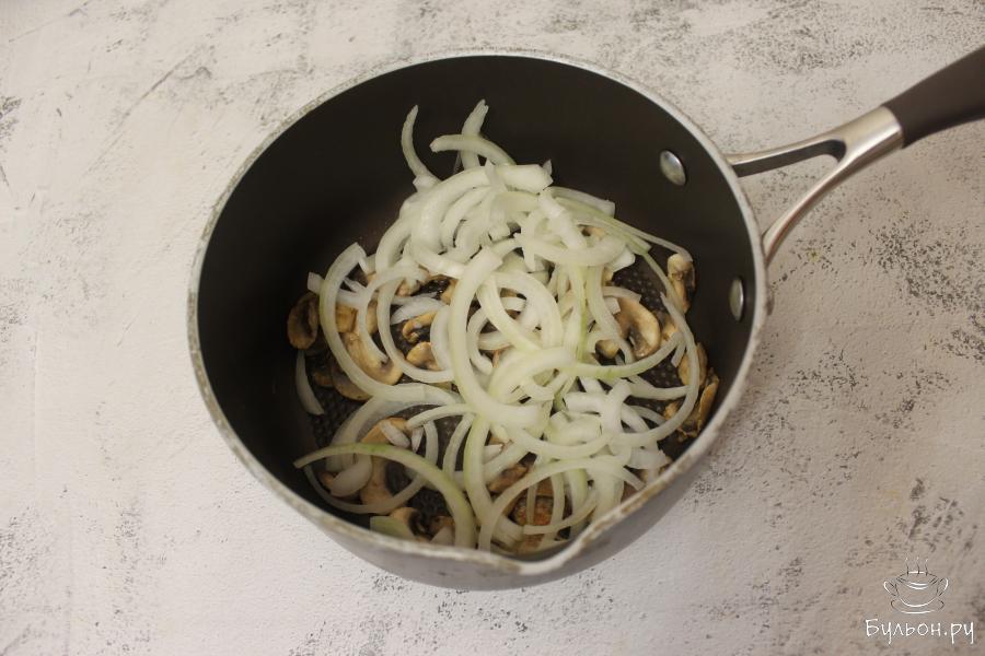 2. Добавьте оливковое масло и выложите к шампиньонам лук, нарезанный полукольцами, продолжайте обжаривать.