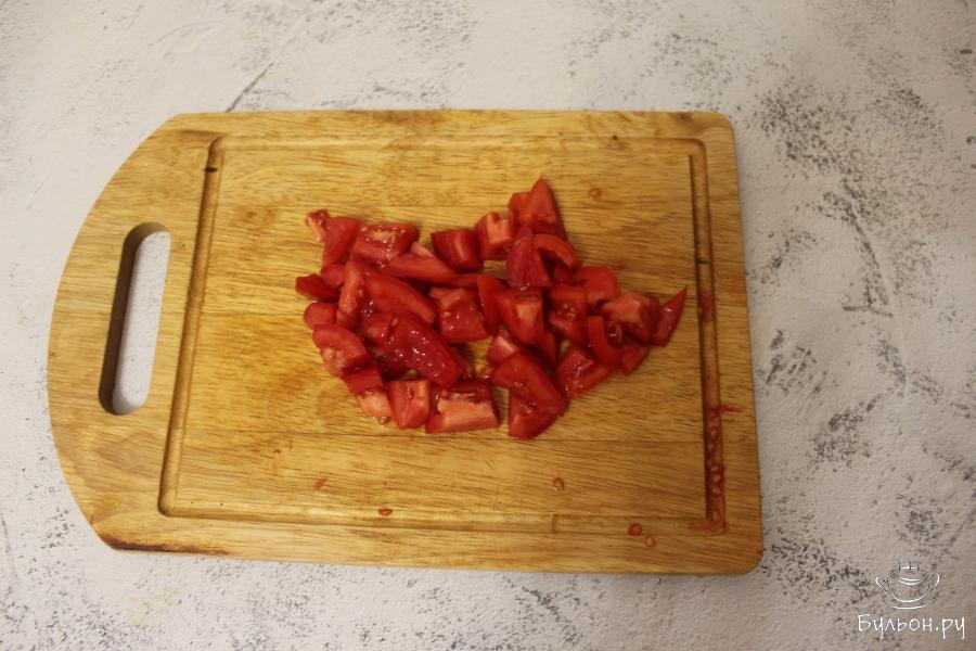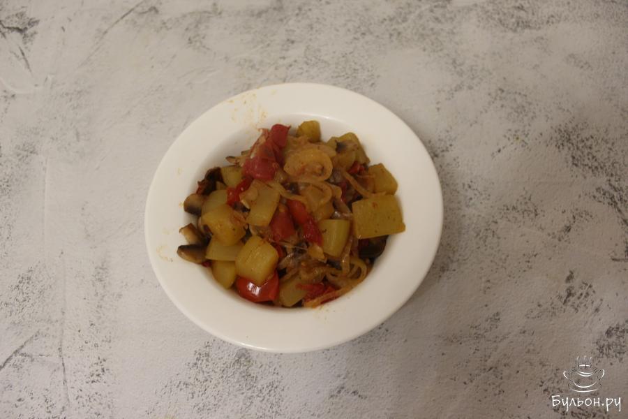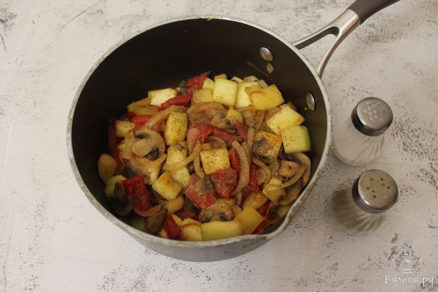 5. Добавьте к грибам с луком нарезанные кабачки и помидоры, посолите, поперчите, перемешайте и тушите под закрытой крышкой до готовности.