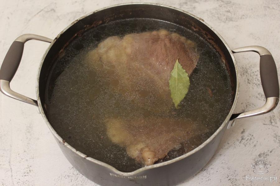 2. Добавьте лавровый лист и черный перец горошком и варите сердце на маленьком огне примерно 1,5 часа до мягкости. Сваренное сердце выньте из кастрюли и дайте остыть.