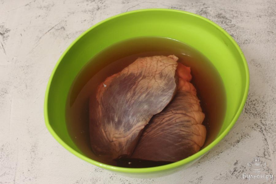 1. Говяжье сердце тщательно промойте, разрежьте пополам и замочите на 1 час в воде. Воду меняйте. Затем переложите сердце в кастрюлю залейте водой и поставьте на огонь. После закипания снимите пенку.