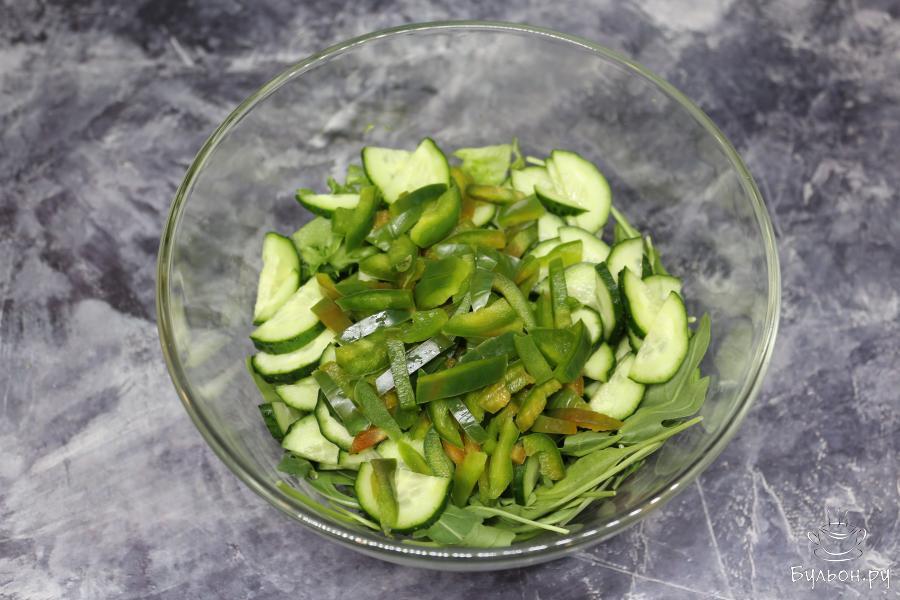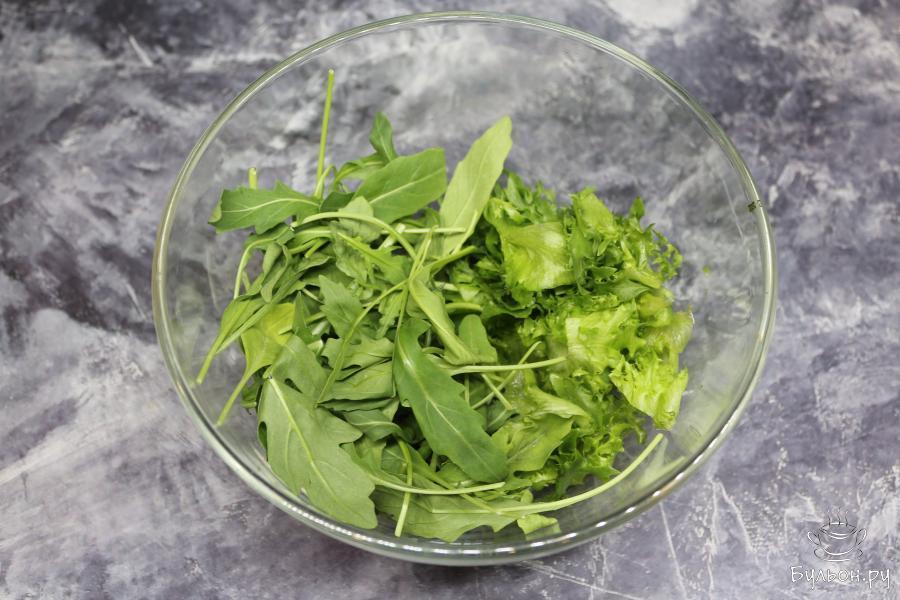 1. Салат фриллис нарежьте на небольшие кусочки или порвите листья руками. Выложите в салатник. Затем выложите рукколу.