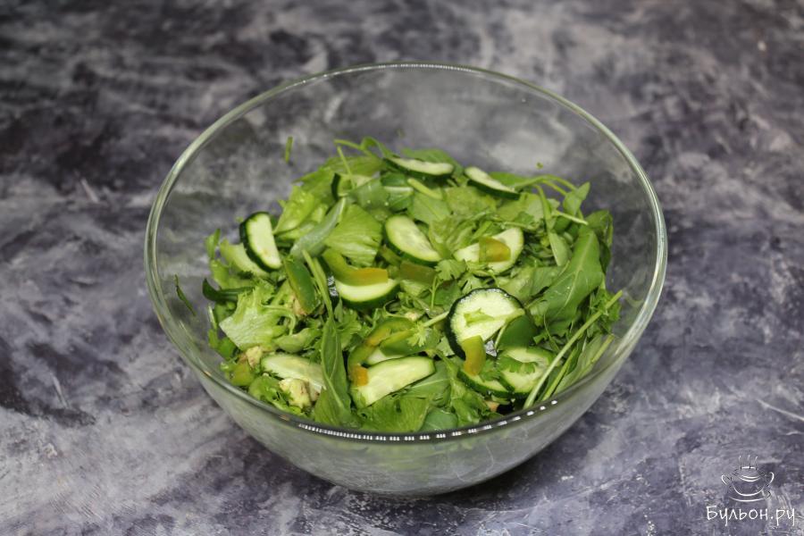 Название - салат "Зеленый" - говорит сам за себя. Как вы уже могли догадаться, этот салат состоит из овощей и салатных листьев, и все это зеленого цвета. При приготовлении салата мною были использованы фриллис, руккола, кинза, зеленый перец, огурцы и авокадо. Салат получился сочным и хрустящим, у него очень привлекательный зеленый цвет, который вызывает аппетит. Но также этот салат очень легкий, поэтому к нему лучше подать, например кусочек мяса, птицы или рыбы.