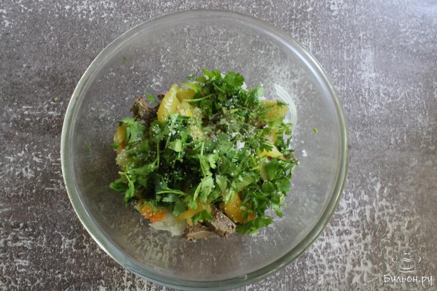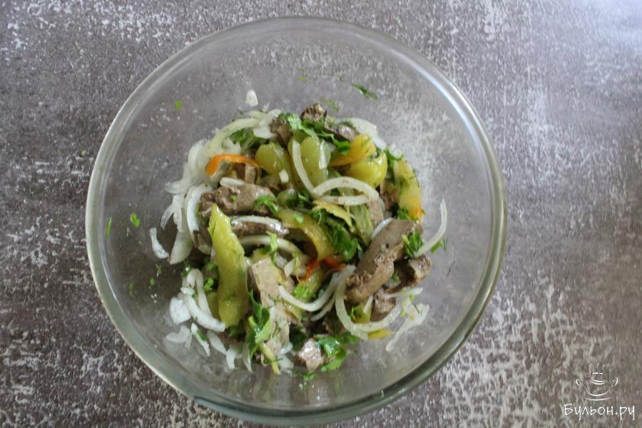 Салат с говяжьей печенью, луком и запеченными перцами - понравится всем, кто любит блюда с субпродуктами. Салат получается вкусный, ароматный, легкий, но и одновременно сытный. Готовится такой салат просто. Время запекания перцев зависит от размера перцев, ориентируйтесь по румяной корочке, по мягкости перцев. Зелень для приготовления салата выбирайте свою любимую, но именно кинза очень дополняет вкус этого блюда. Такой салат может заменить порцию обеда или ужина в разгрузочные дни.