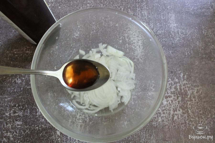 2. В это время тонко нашинковать лук, промыть, залить его водой, добавить уксус и оставить мариноваться.