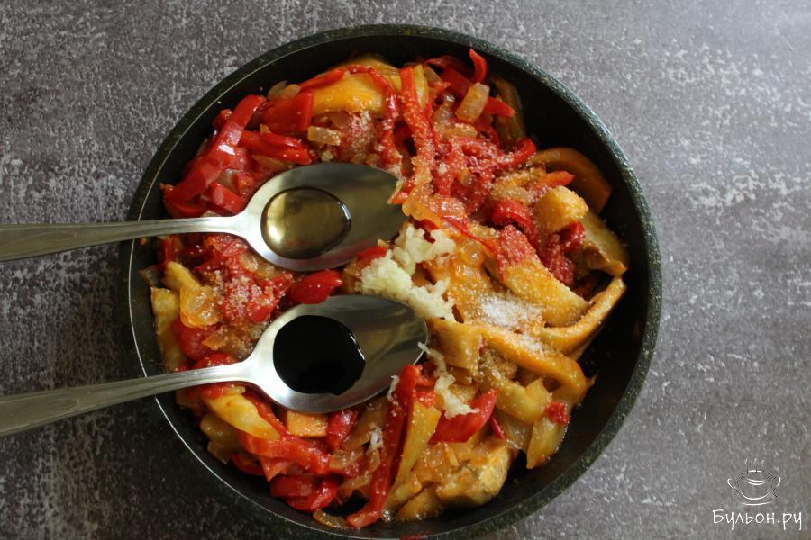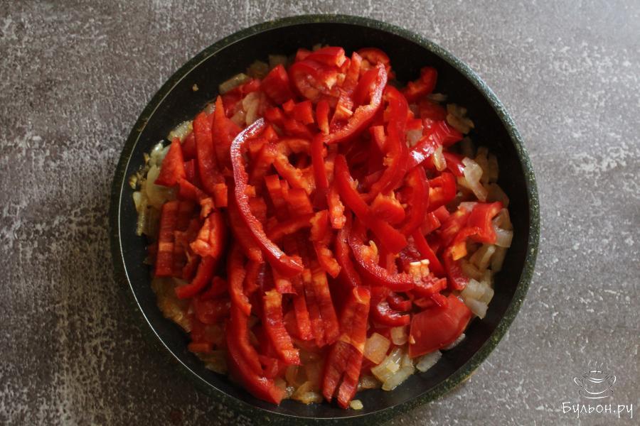 3. Красные болгарские перцы почистить, промыть, нарезать полосками, выложить на сковороду и обжарить все вместе еще несколько минут.