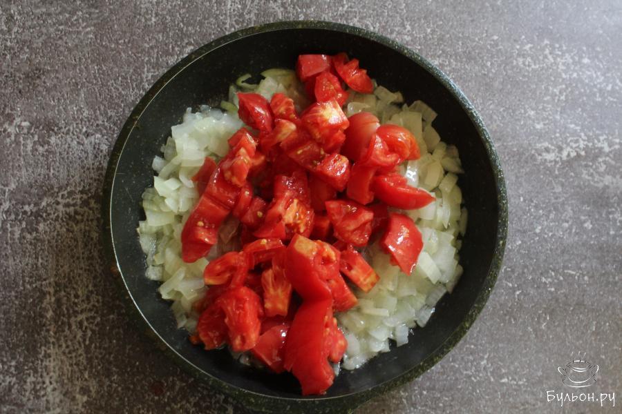 2. Помидоры промыть, нарезать кубиками, добавить на сковороду и обжарить все вместе несколько минут.