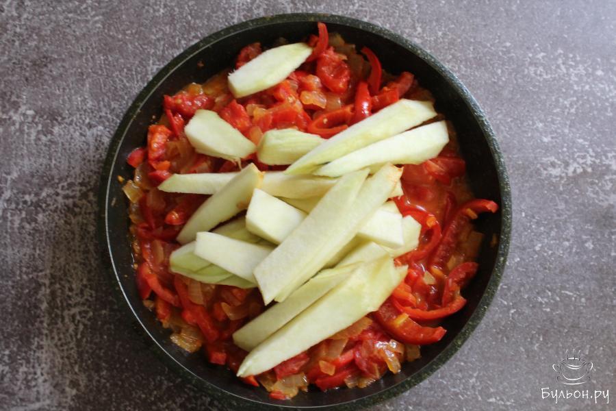 4. Баклажаны почистить, нарезать полосками, выложить на сковороду и готовить все вместе 15 минут. Убрать сковороду с огня.