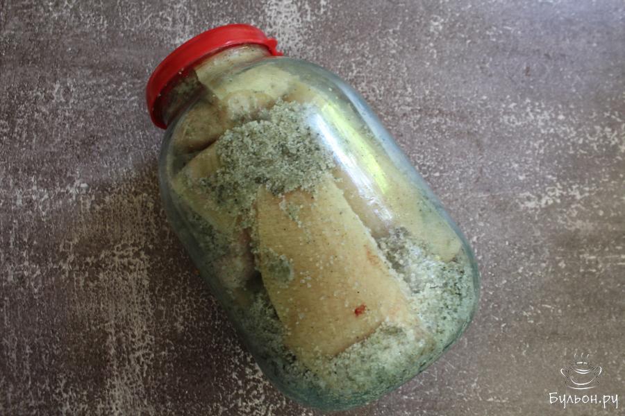 6. Через четверо суток сало будет готово. Его можно держать в банке, можно переложить в пакет и убрать в морозильник. Это по желанию.