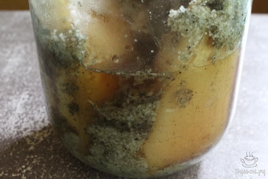 5. В течение этого времени в банке будет появляться рассол, это нормально. Через двое суток банку убрать в холодильник еще на двое суток.