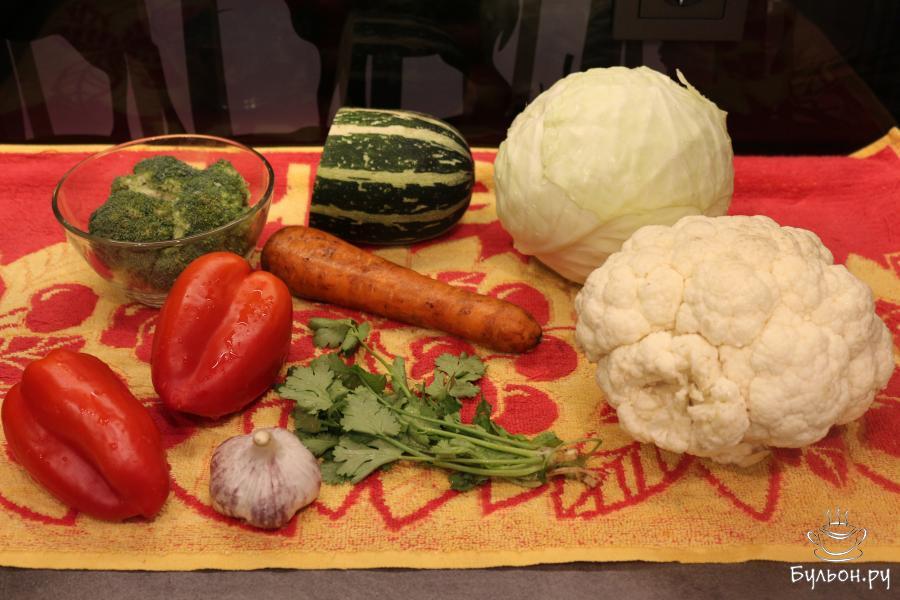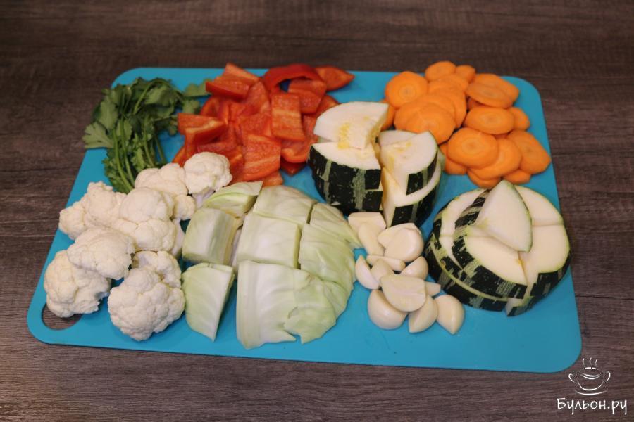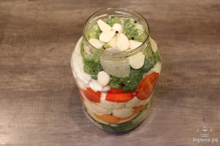 3. Выложите овощи в банку или банки, в зависимости от их размера. Можете выкладывать слоями каждый овощ, а можете выкладывать их в хаотичном порядке. Также выложите чеснок и кинзу.