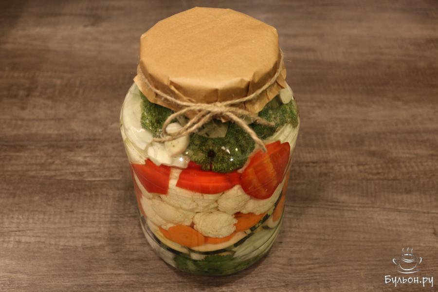 5. Закройте крышкой и оставьте овощи готовиться на 4 дня. Один раз в день открывайте крышку. Это нужно, чтобы выходили пузырьки. Как только овощи будут готовы, переставьте их в холодильник. Хрустящие и полезные овощи готовы.