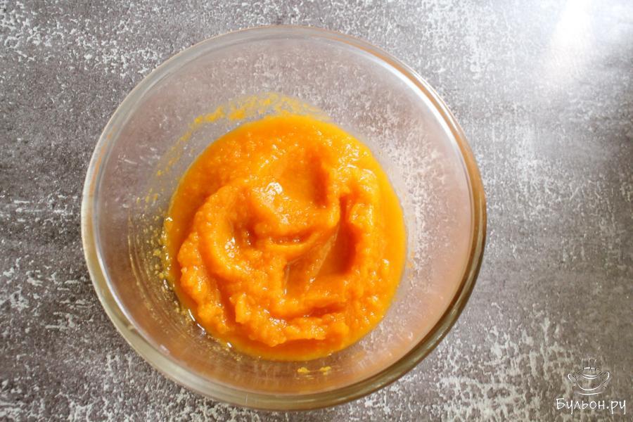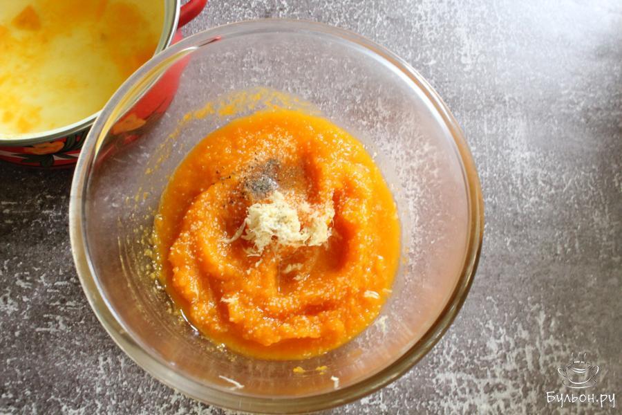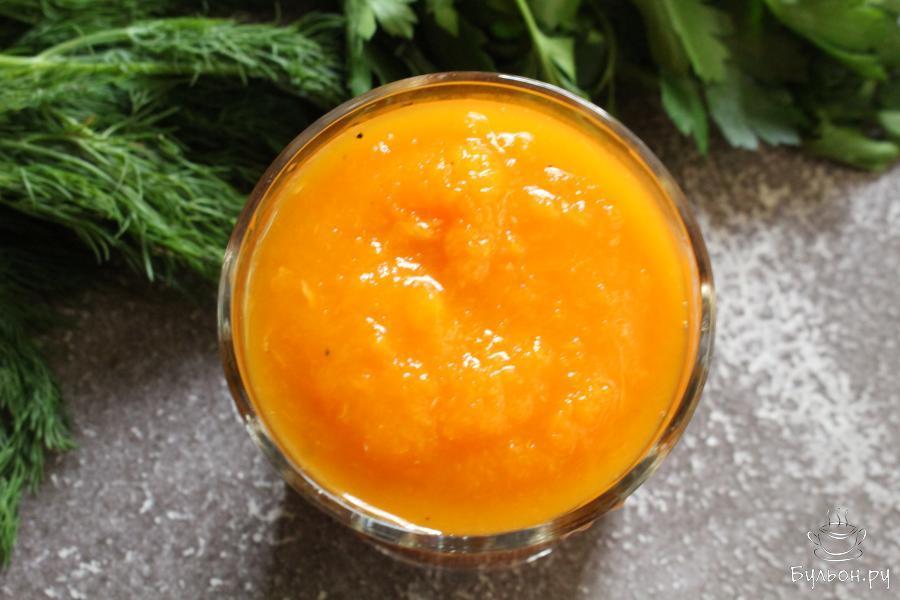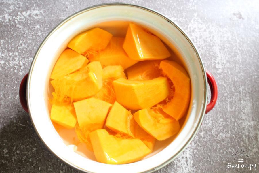 1. Тыкву почистить, промыть, нарезать произвольно и выложить в кастрюльку. Добавить овощной бульон и варить тыкву до мягкости.