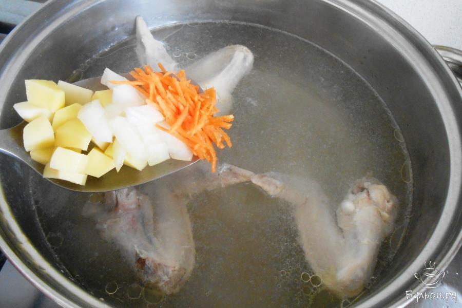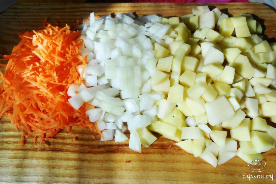2. Овощи почистить от кожуры и промыть. Картошку и луковицу нарезаем не крупными кусочками, морковку натираем на средней терке.