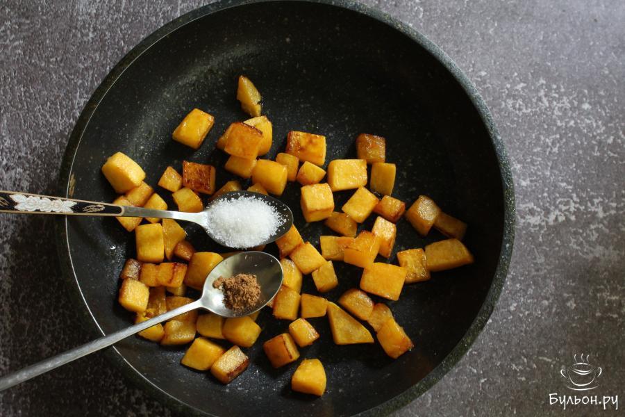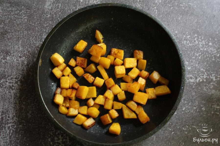 3. Тыкву почистить, нарезать мелкими кубиками и обжарить на сливочном масле до румяного цвета и мягкости.
