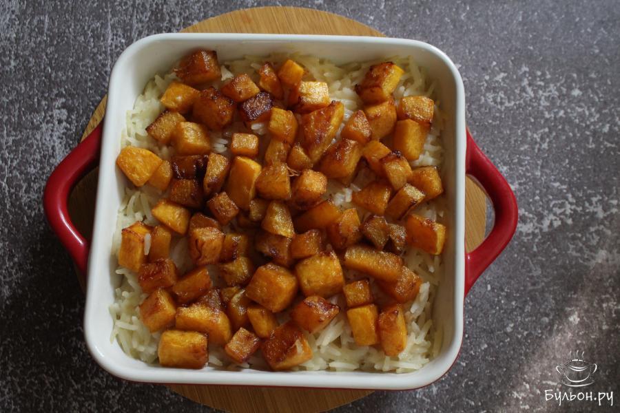 9. Сверху на рис выложить тыкву. Готовить запеканку в духовке 15 минут, при температуре 180 градусов.