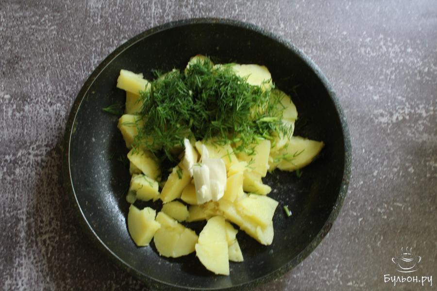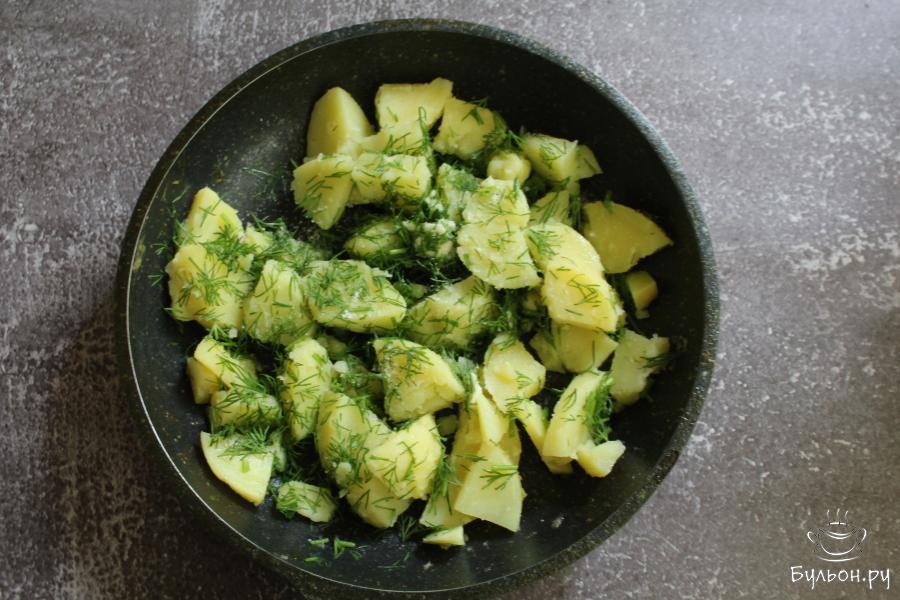 2. На сковороде разогреть половину масла. Картошку нарезать пластинками, выложить на сковороду и добавить мелко нарезанный укроп. Посолить.