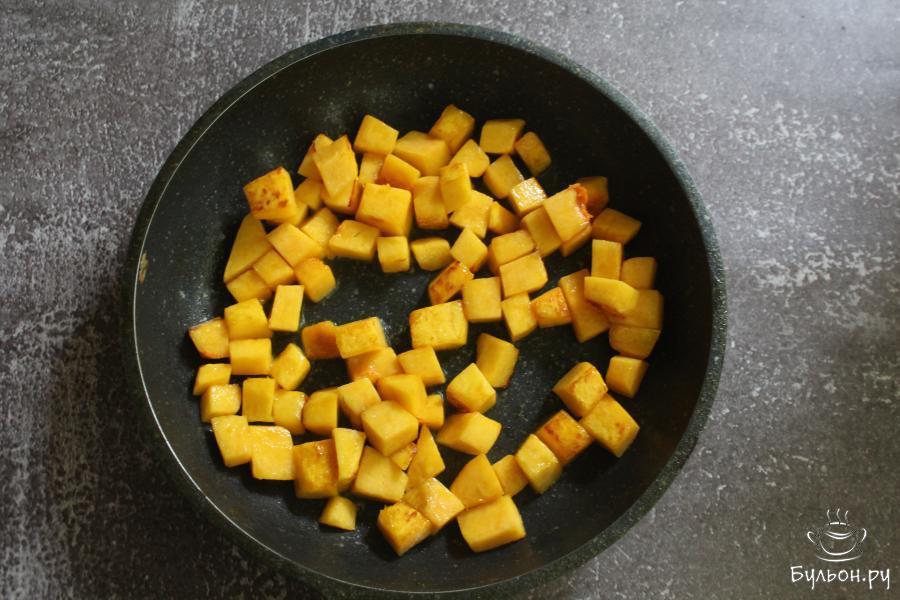 5. Тыкву почистить, нарезать мелкими кубиками и обжарить на сковороде с оставшимся маслом. Обжаривать тыкву до мягкости и румяной корочки. Посолить по вкусу.