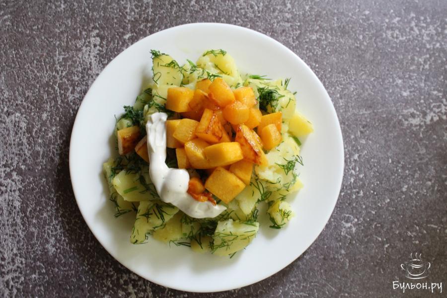6. Выложить тыкву на картошку и украсить соусом, майонезом или сметаной. Я использовала соус Цезарь.