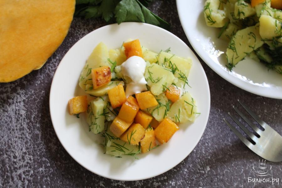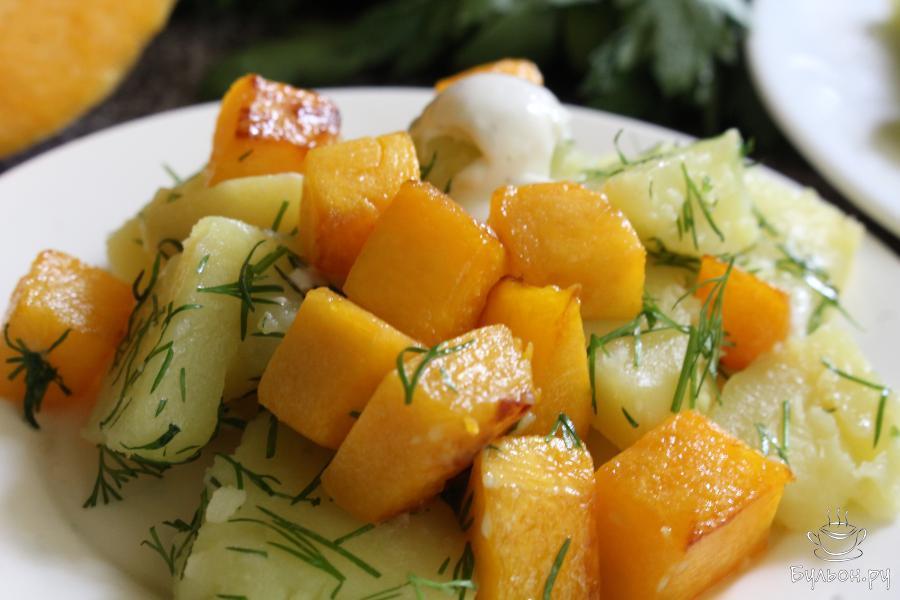 Гарнир из вареной картошки и жареной тыквы можно подать не только как гарнир, но и как самостоятельное блюдо, если вы отдыхаете от мясной пищи. Это блюдо готовится просто и получается оно сытное, вкусное и полезное. Такой гарнир вкусный как в горячем, так и в холодном виде. Если вы придерживаетесь вегетарианского или постного питания, то это блюдо можно подать без соусов. А вегетарианцы могут украсить гарнир сметаной или постным майонезом.