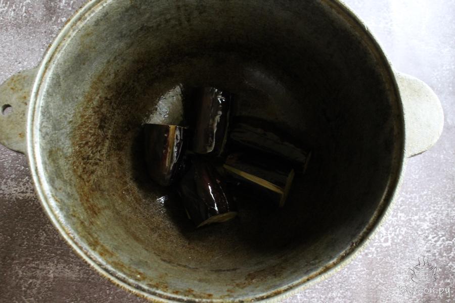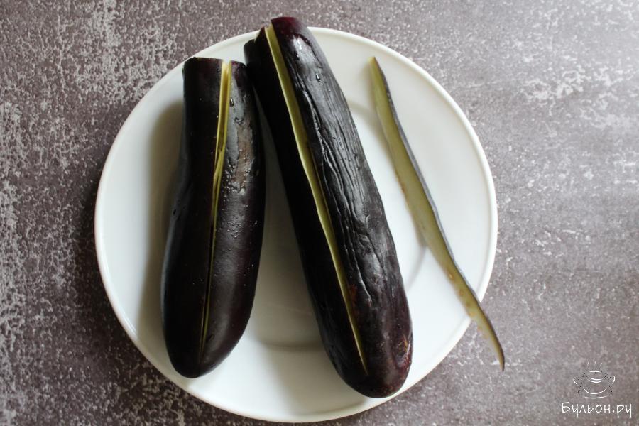 1. Баклажаны промыть, обсушить. Вырезать на каждом баклажане, вдоль по окружности, узкие продольные бороздки, через одну.