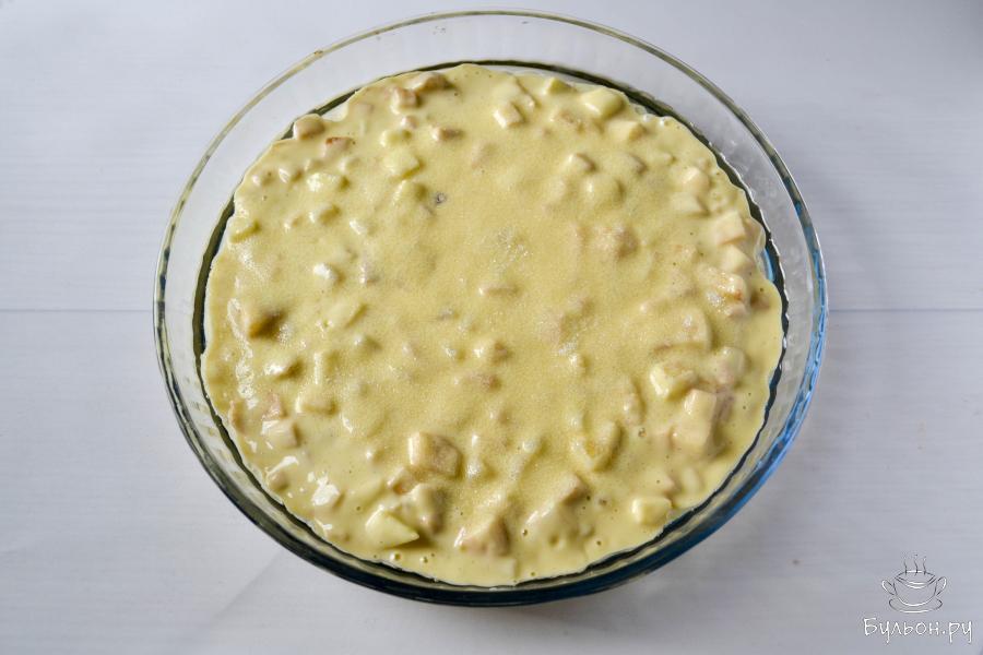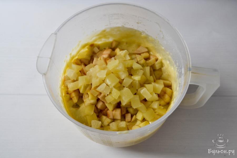 5. Ананасы достаньте из сиропа и нарежьте мелким кубиком. Добавьте в тесто яблоки, нарезанные на маленькие кубики и нарезанный ананас. Яблоки предварительно очистите от кожуры и вырежьте семенную камеру. Перемешайте тесто с фруктами.