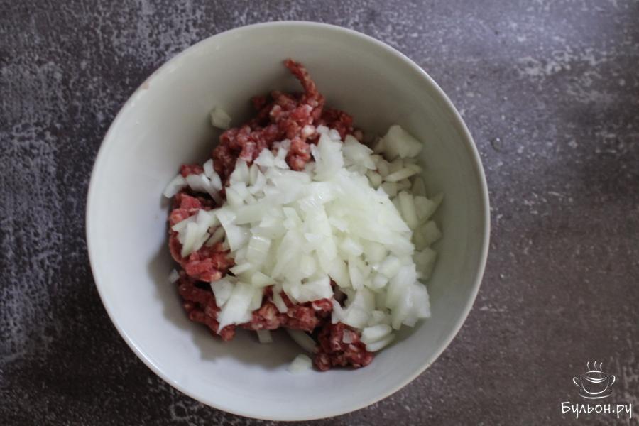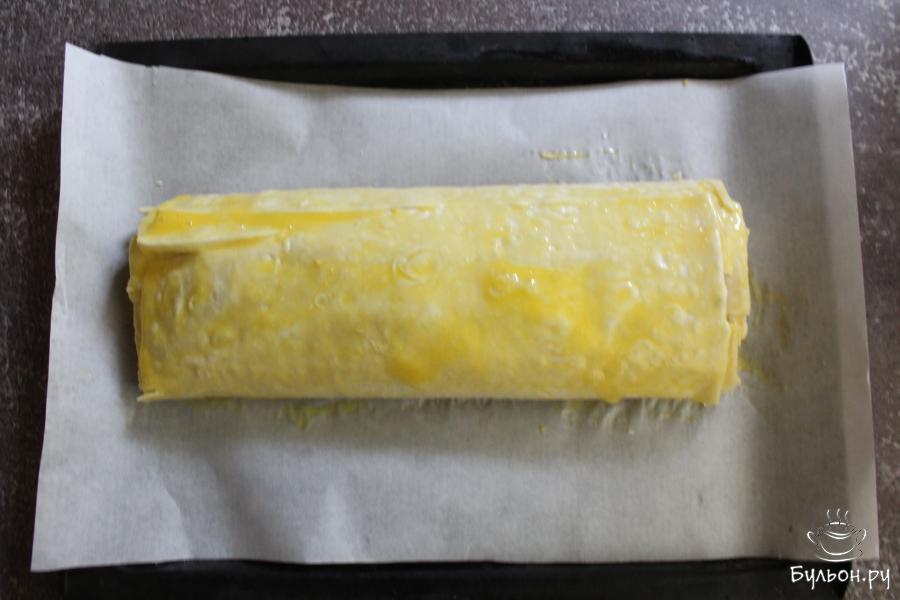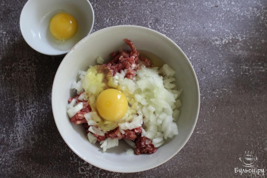4. Одно яйцо разделить на желток и белок, желток оставить для смазывания рулета. Второе яйцо и белок добавить в фарш.