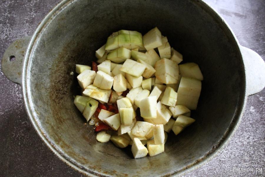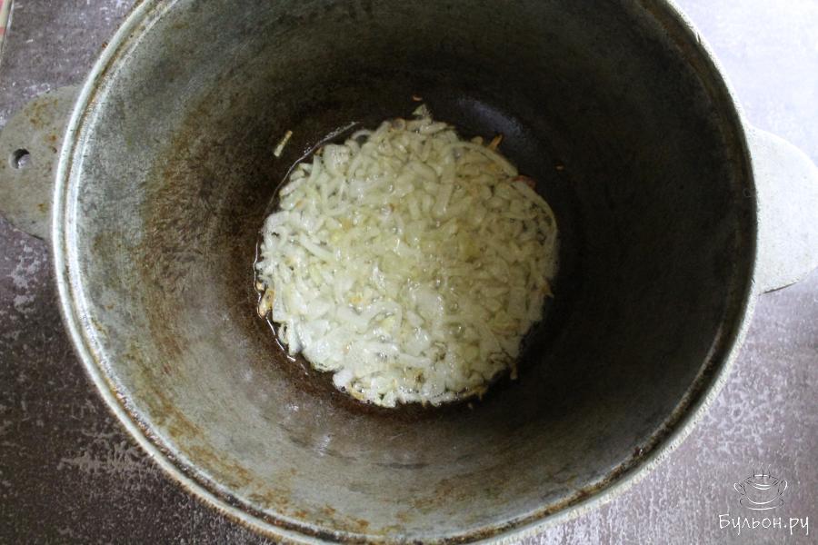 1. Лук, баклажаны и перцы почистить, все овощи и зелень промыть. Лук нарезать мелко и обжарить его 2-3 минуты в казане, на разогретом масле.