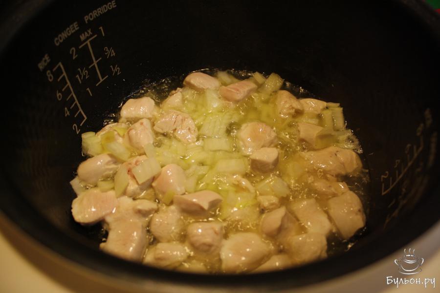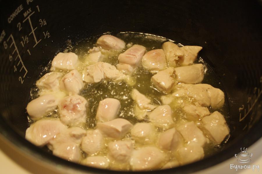 1. Филе промыть, порезать кубиками стороной 2-3 см. Обжарить на раскаленном маслев мультиварке на программе "Жарка" или в кастрюле с толстыми стенками.