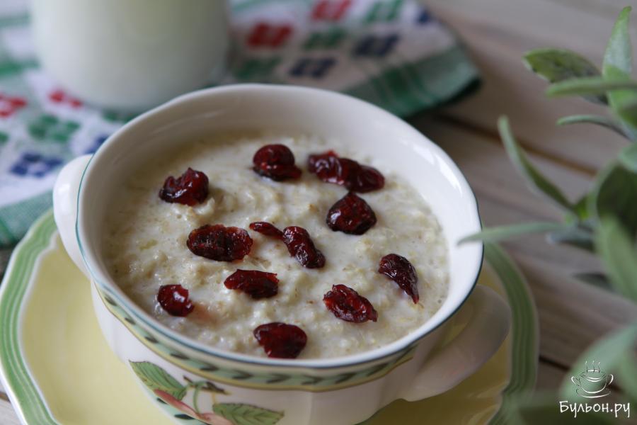 Овсяная каша - это самый полезный, вкусный и здоровый завтрак, как для детей, так и для взрослых. Готовят ее как правило на молоке. Молоко выбирают разное: коровье, козье, кокосовое, а иногда его даже разводят водой в соотношении 1:1. По желанию в готовую кашу одни добавляют сухофрукты или орехи, другие, мед, джем, сливочное масло, кстати, последним кашу не испортишь (не зря на эту тему существует поговорка). Сегодня я с огромным удовольствием хочу предложить рецепт каши из овсяных хлопьев на молоке с вяленой клюквой. Этот простой, но в то же время вкусный рецепт, может оказаться в копилке многих хозяек.