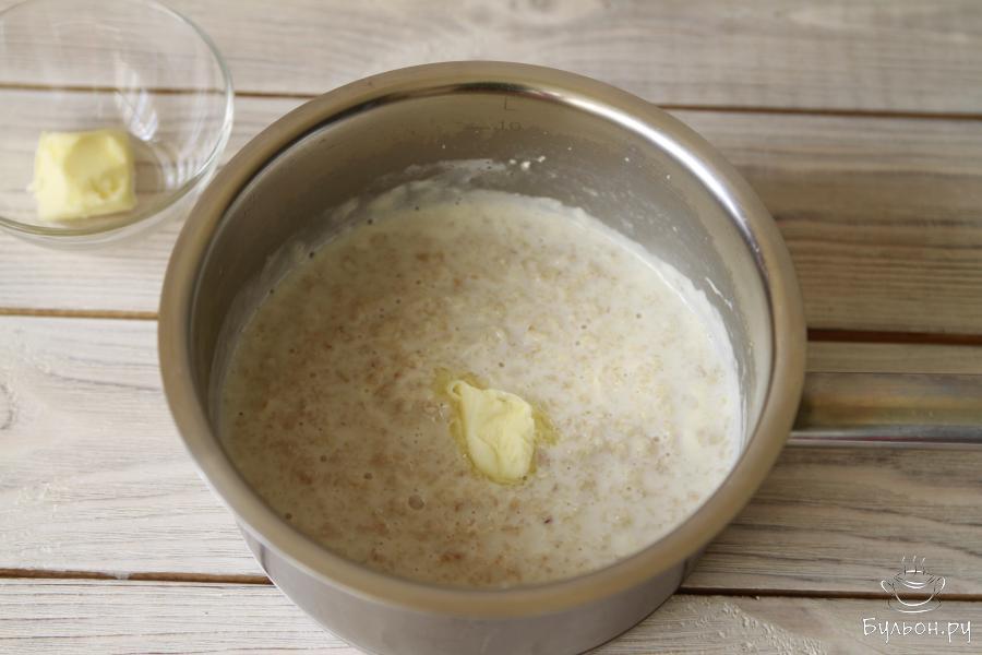 4. Время приготовления каши зависит от хлопьев. Варить их необходимо согласно инструкции, которая указана на упаковке. В процессе приготовления помешиваем хлопья ложкой, задевая дно посуды. По готовности сотейник с кашей снять с огня, добавить сливочное масло и накрыть посуду крышкой.