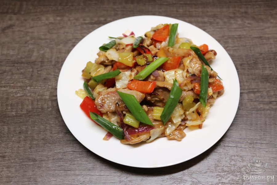 7. Затем добавьте в миску к овощам готовое мясо, добавьте кисло-сладкий соус, перемешайте. Выложите на блюдо, посыпьте сверху резанным зеленым луком.