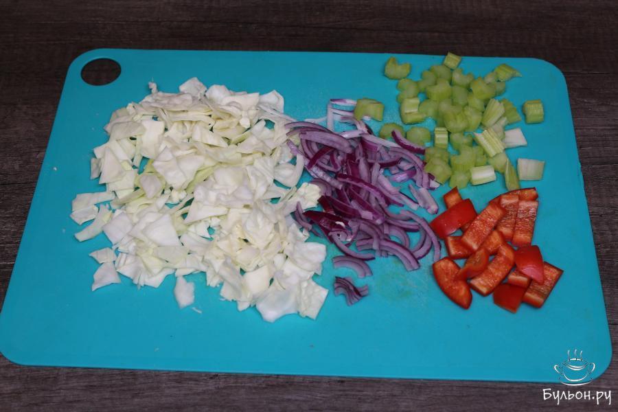 4. В это время нарежьте на небольшие кусочки стебель сельдерея, болгарский перец и капусту. Лук нарежьте перышками.