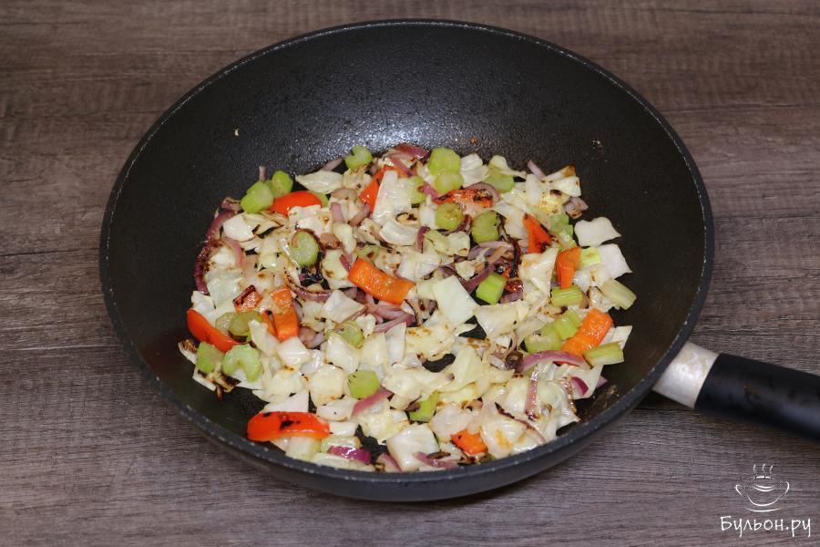 5. В сковороду влейте масло, разогрейте и обжарьте на нем сельдерей, перец, капусту, лук буквально пару минут. Добавьте измельченный чеснок, имбирь, обжарьте все ингредиенты еще пару минут.