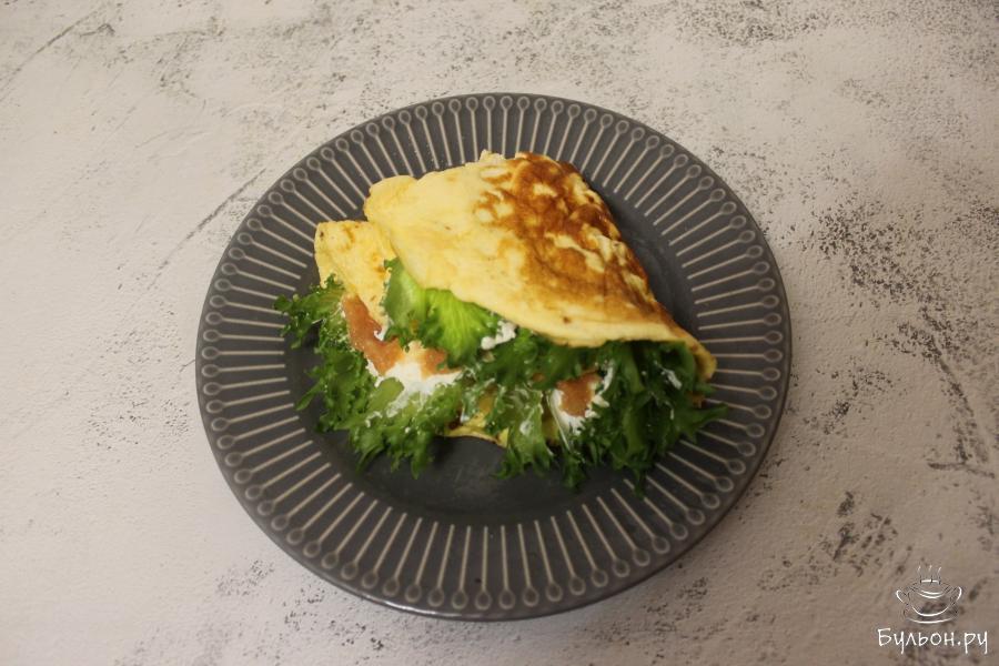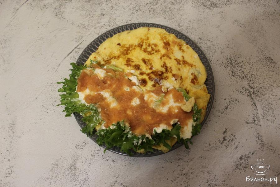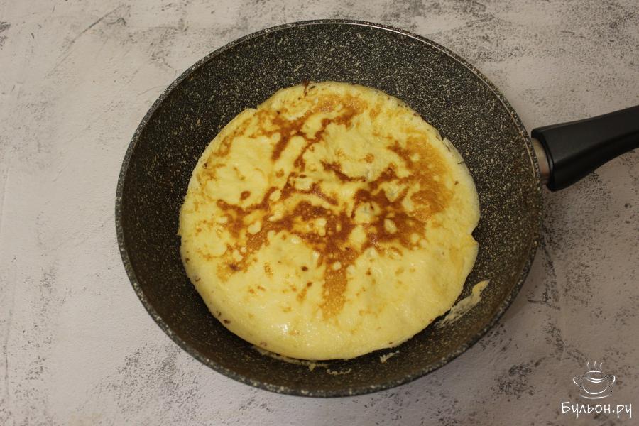 3. Переверните и обжарьте тонкий омлетный блин со второй стороны. Приготовьте из оставшейся яичной смеси второй блин.