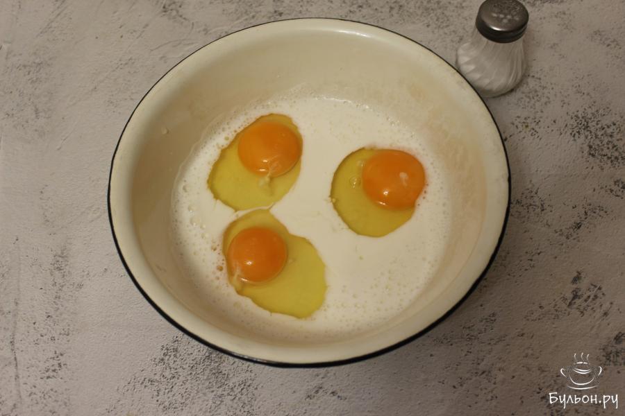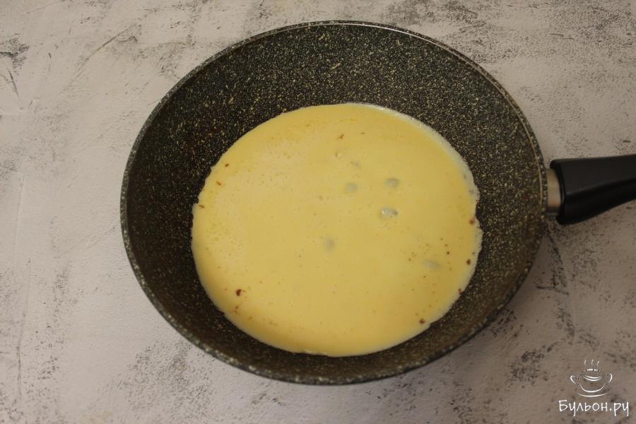 2. На сковороде растопите кусочек сливочного масла, затем вылейте половину яичной смеси и дайте ей схватиться.