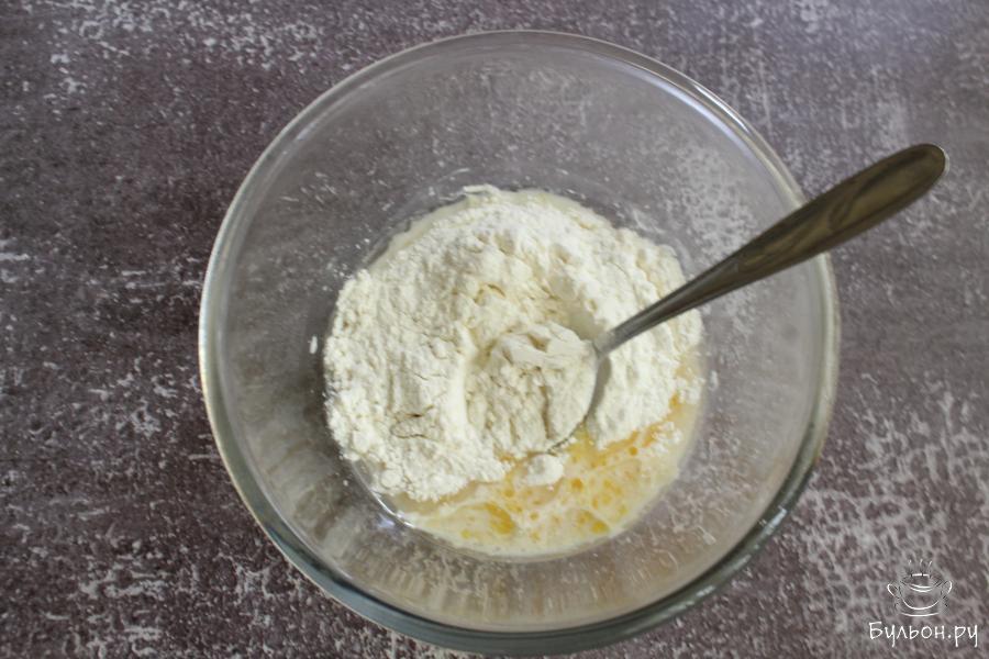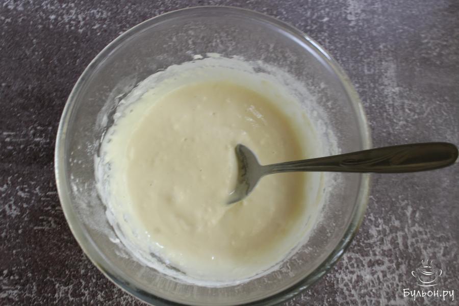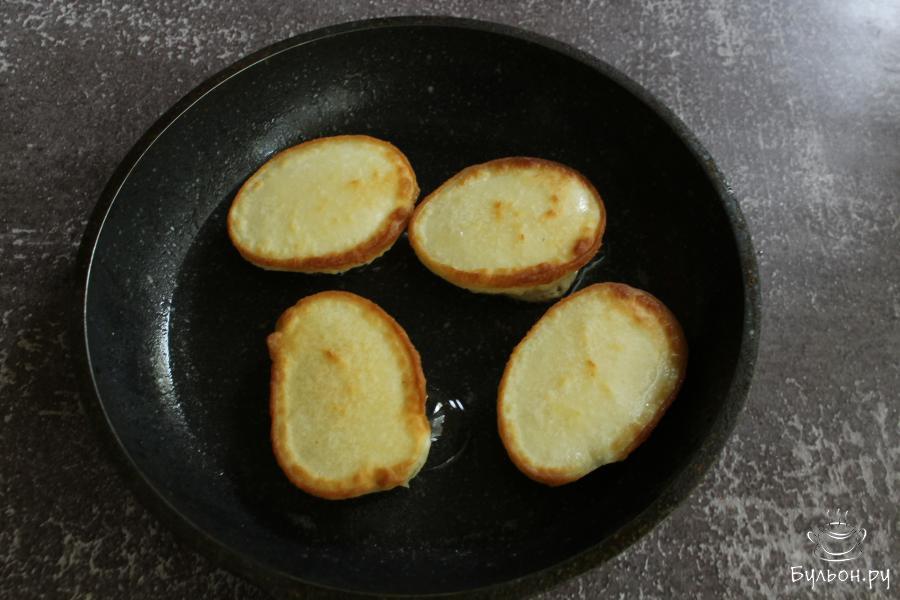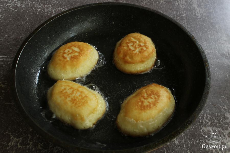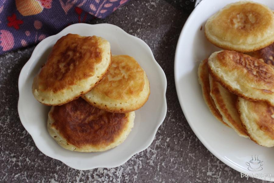 6. На сковороде разогреть масло, выкладывать оладьи столовой ложкой. Жарить до румяности с одной стороны.