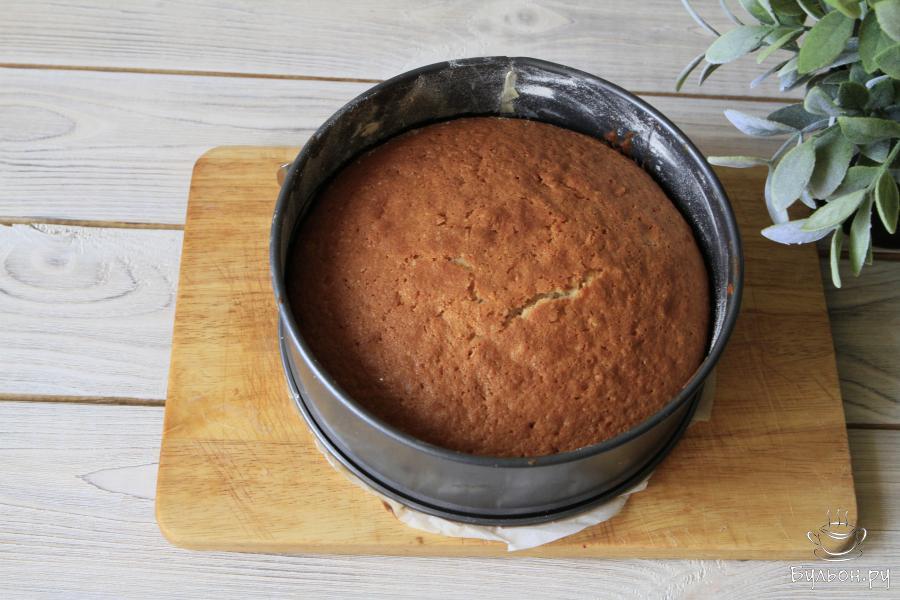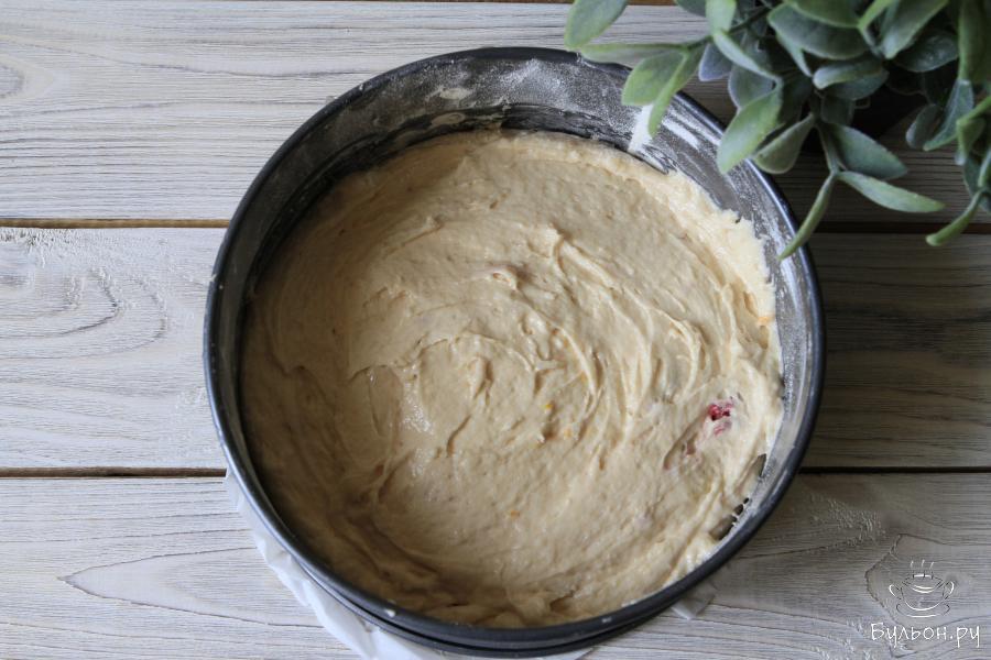 7. Добавляем остатки муки и замешиваем тесто. Тесто получится достаточно густым. Делим его на три части и выкладываем в форму для запекания (у меня форма диаметром 18 см), предварительно застелив ее пергаментом. Можно выпечь один большой корж, а затем разделить его на три части.